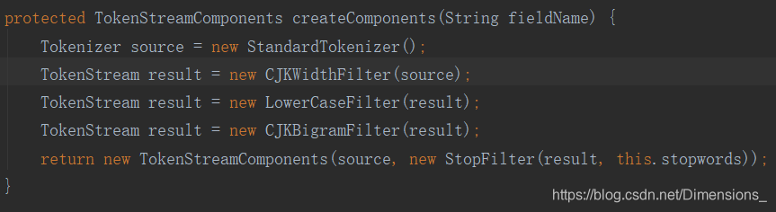 将需要的Tokenizer,及Filter传入TokenStreamComponents , TokenStreamComponents是Analyzer的内部类。