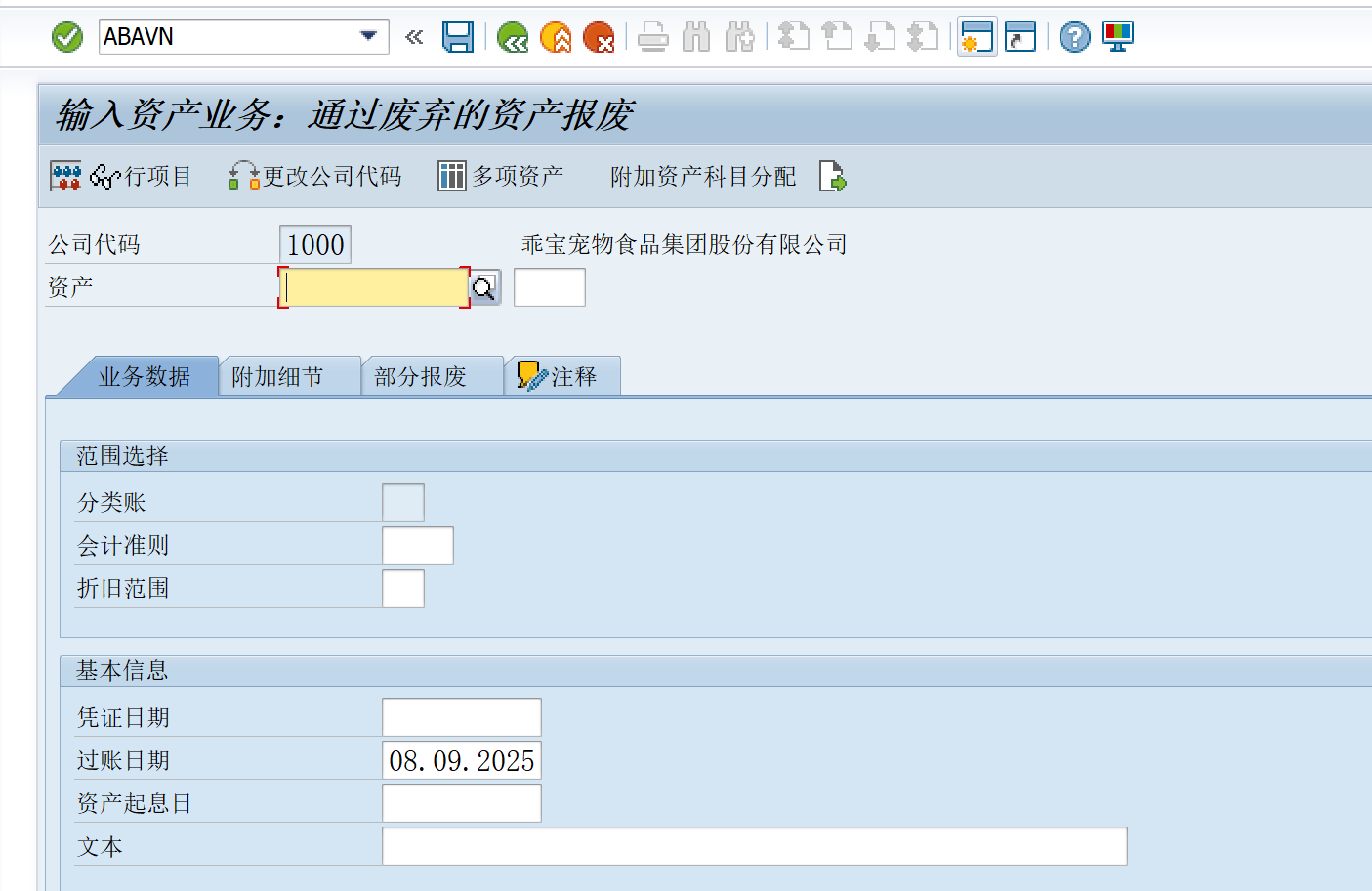 当年报废用 250、往年报废用 200,这是 SAP 标准配置,填错了会导致 “报废后资产价值算错”。如果不知道填什么,可在 SAP 里查 “资产交易类型配置”(事务码 AO73)。 -