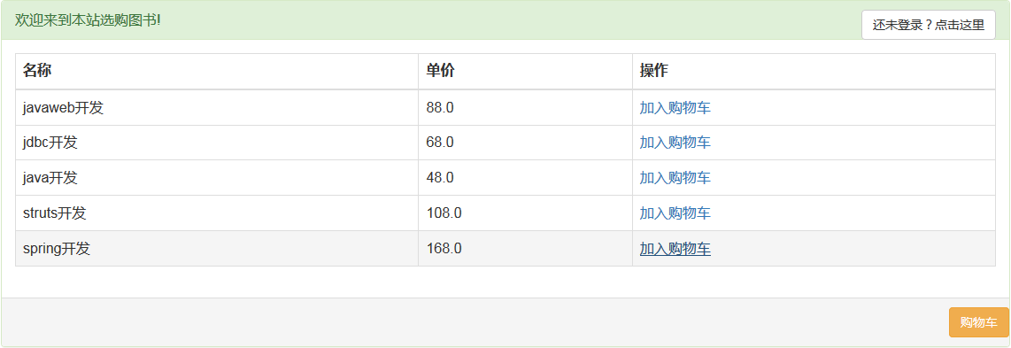 应用Filter实现添加购物车访问控制:进入主页后,单击“加入购物车”链接,如果用户尚未登录则直接跳转到登录页面,登录后用户查看购物车或者继续购物,也可以付账。