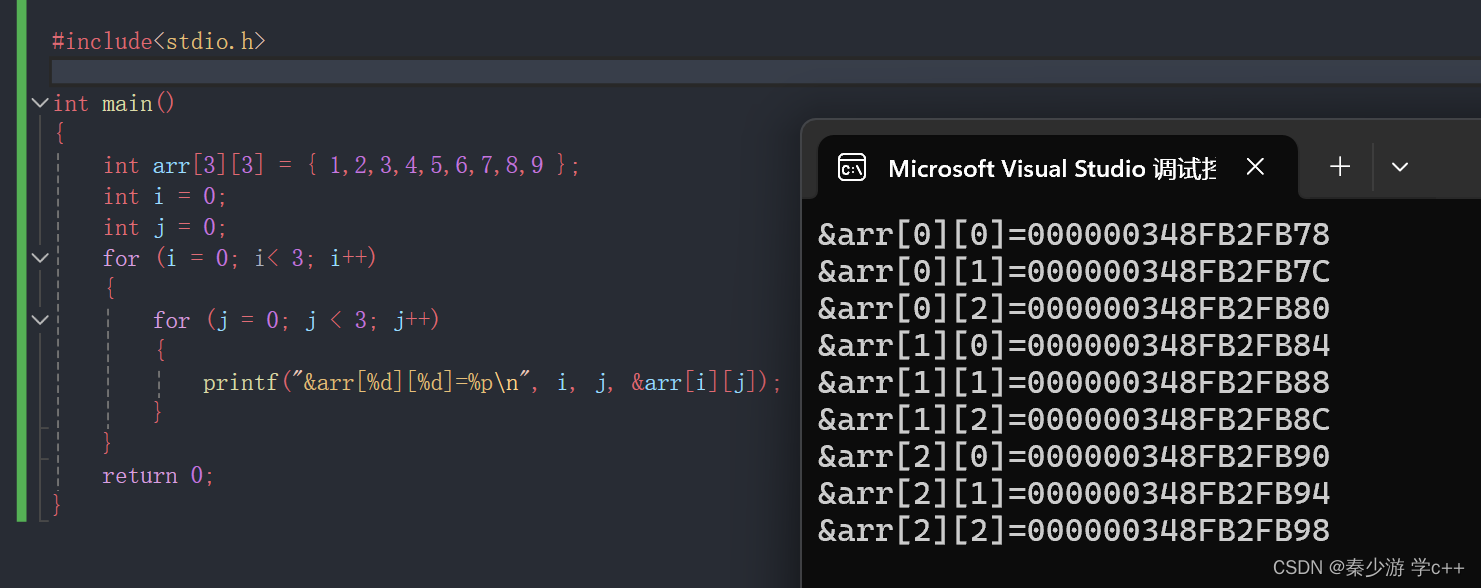 由上运行结果可得知:二维数组的存储也是连续存放的