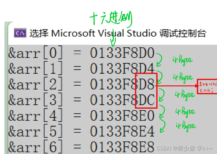 从上面的地址我们可以发现:当数组元素的下标增大时,该数组对应的地址也跟着增大,相差4(单位 byte )是因为我们举例子的这个数组元素的类型是int ,int 类型的变量在空间中占4字节.---> 数组中的元素在内存中连续存放