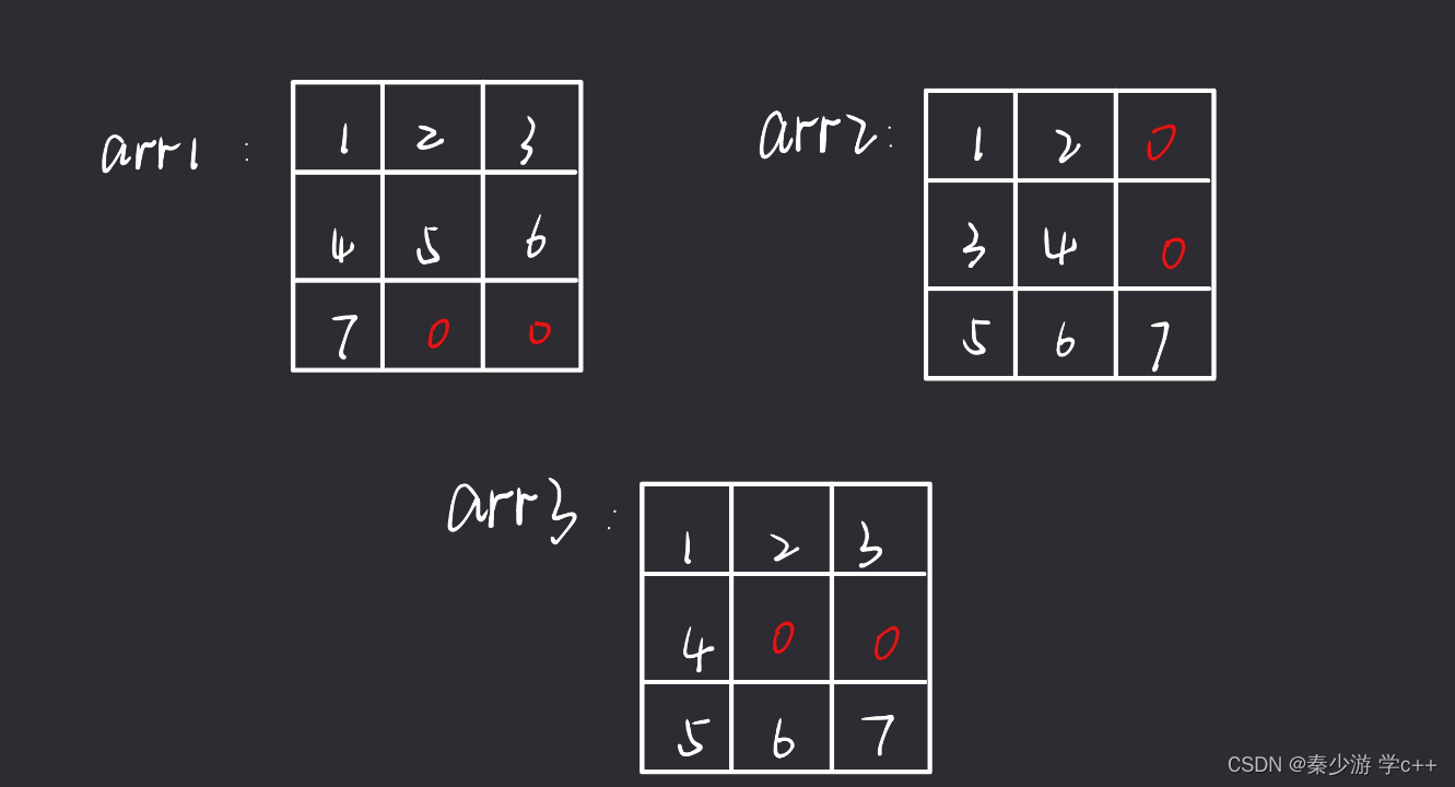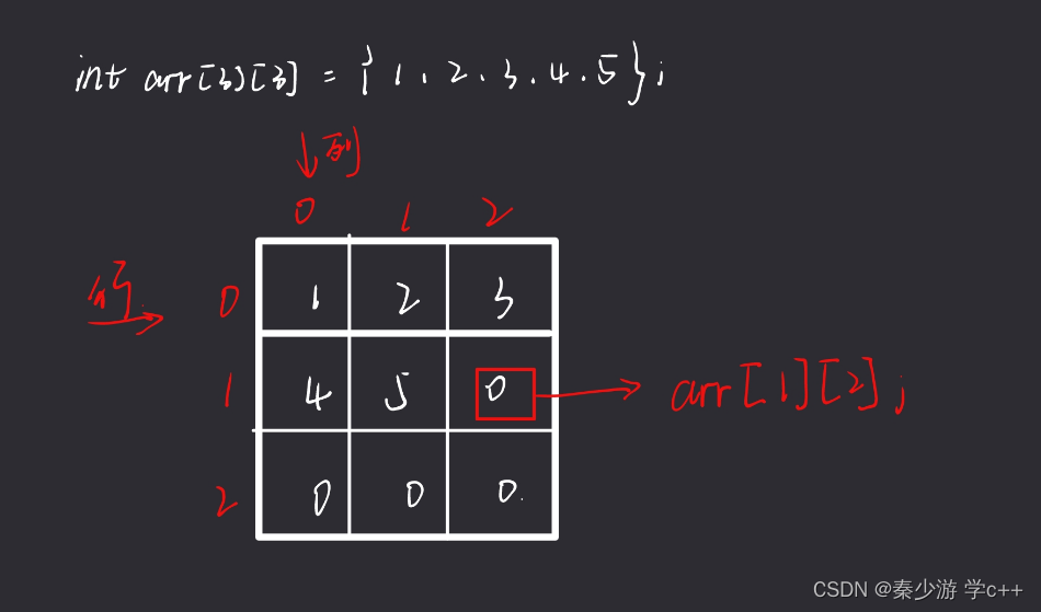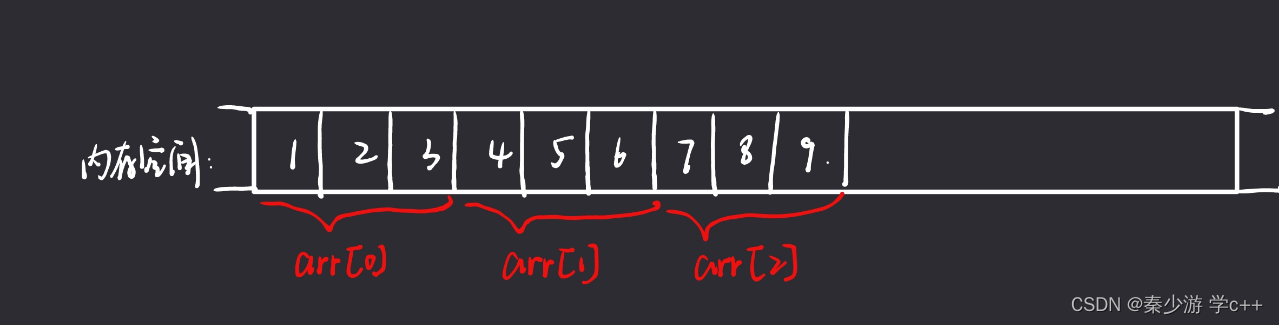 int arr[][3] = {1,2,3,4,5,6,7}; //一行规定得有三个元素,多的就往后面叠