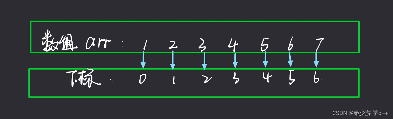 int arr[7]; int--该数组中存放元素的类型为 int ; arr-- 数组名 ; [] -- 下标操作符 ; 7 -- 数组中存放7个元素