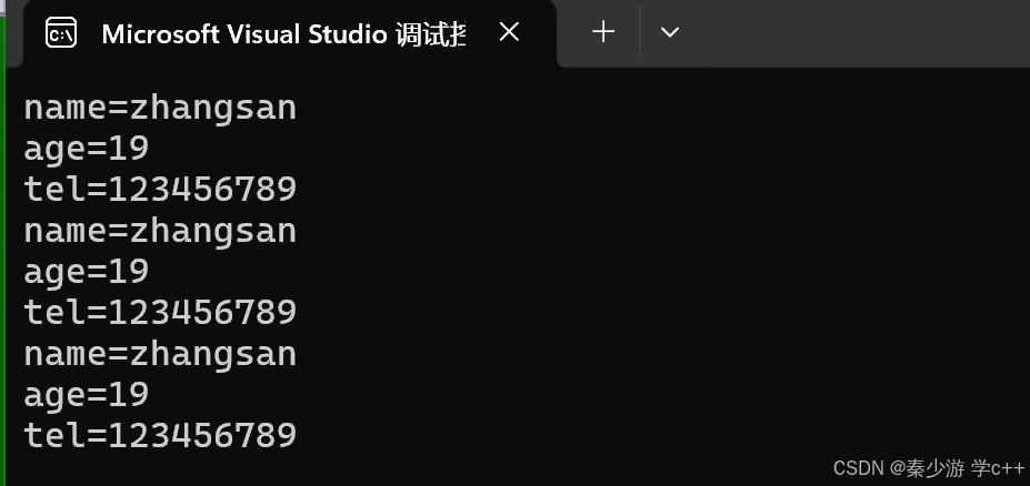 printf("name=%s\nage=%d\ntel=%s\n", s.name, s.age, s.tel);