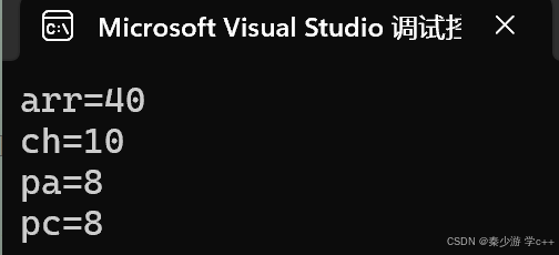 注:数组传参,传的是数组首元素的地址,即pa、pc 为指针变量,而指针变量在内存中所占的空间是由平台决定的,在x86 环境下为 4byte,在x64 环境下为 8byte;而数组在内存中是连续存放的,即 sizeof(arr), arr 代表的是整个数组,那么求的就是整个数组在内存中所占的空间,由于 arr 数组元素的类型为 int 类型,int 类型在内存空间中占 4byte,而数组 arr 中有10个元素,故而 sizeof(arr) = 40 ; 单位是字节;