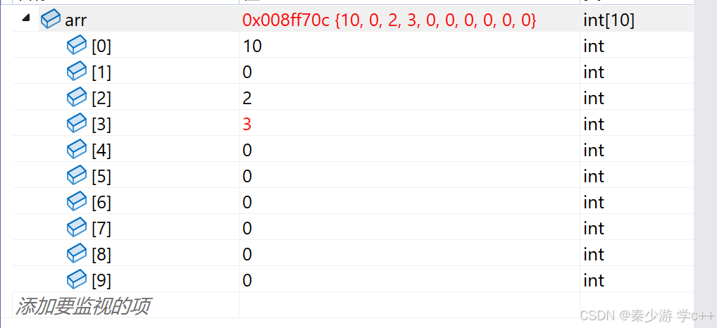 int arr[10] = { 0 }; //数组的初始化 ; [ ] 的操作数为 arr 和 10