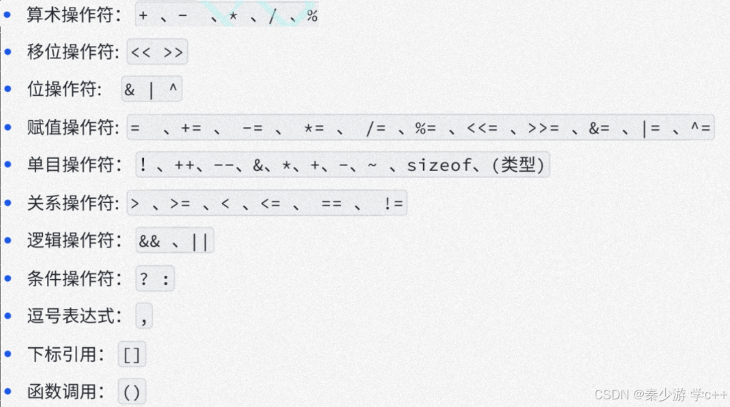 本文:赋值操作符 、复合操作符 、单目操作符 、关系操作符 、逻辑操作符 、条件操作符 、逗号表达式 、下标引用操作符 、函数调用操作符 、结构体成员