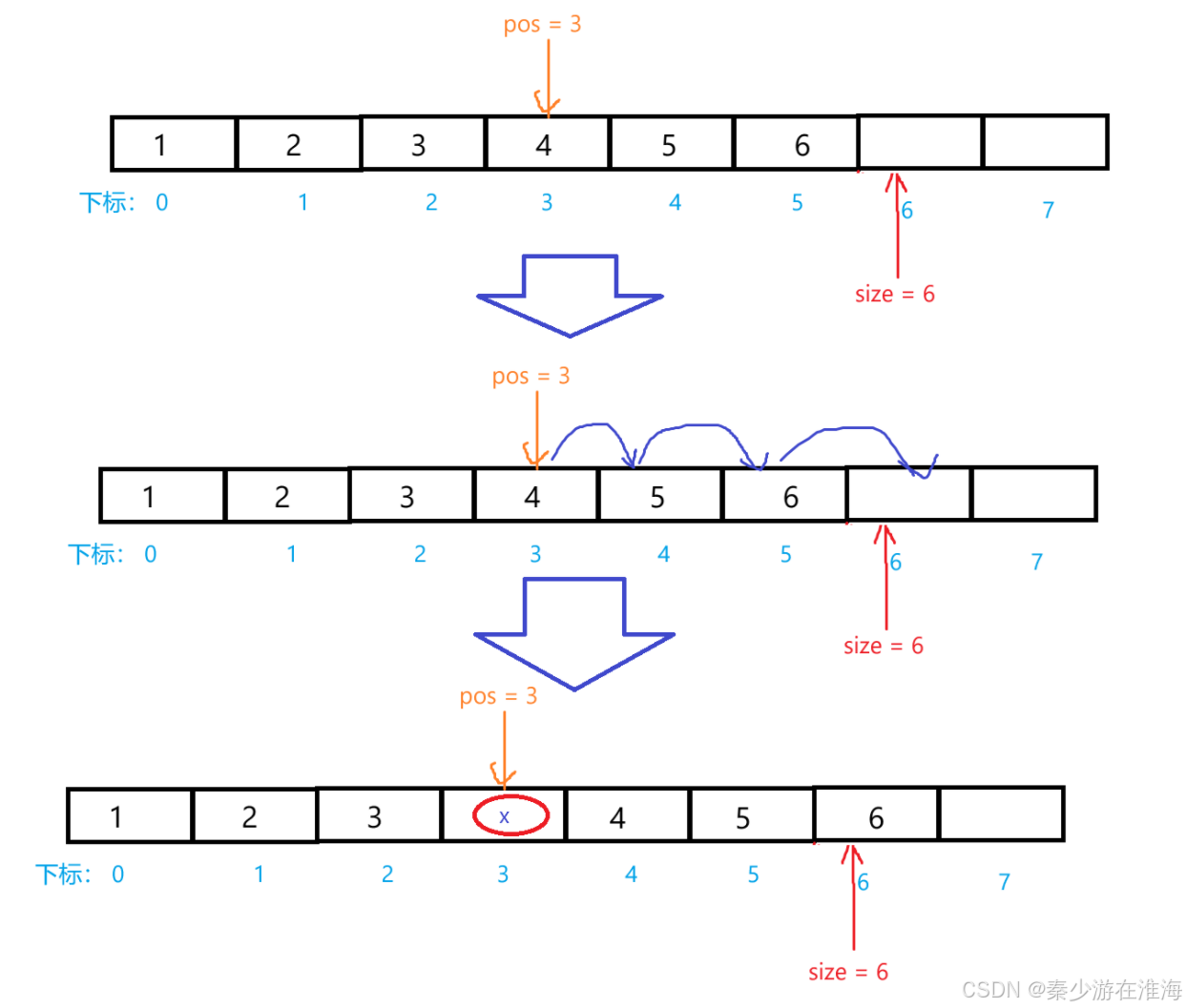 //删除的本质就是将pos 位置上的数据进行覆盖,让pos 后面的数据向前挪动,覆盖pos 上的空间