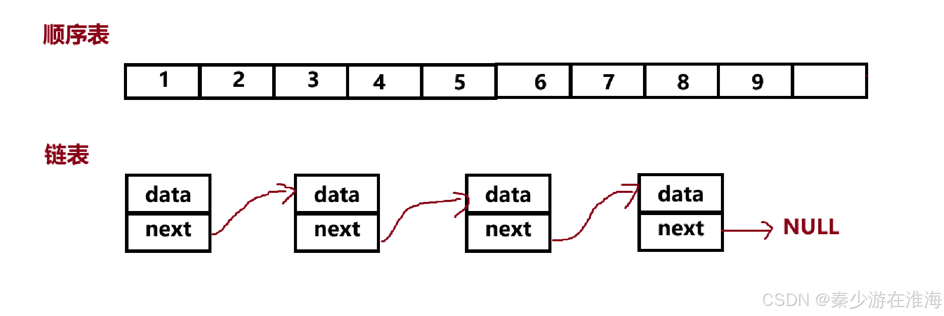 - 链表:如果你要存放一个数据便要申请一块空间,每存放一个数据便要申请一块空间……利用指针将这些空间链接起来;存放数据比较方便并且不存在巨大的消耗,因为链表无需像顺序表在插入、删除数据时还要一个一个地挪动数据,只需要改变结点之间的链接关系即可;