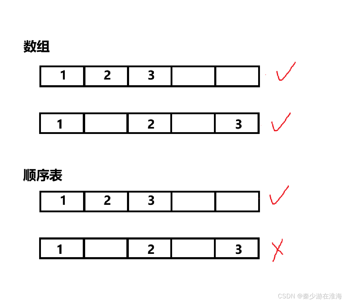 2、顺序表就是数组,但是在数组的基础上,它还要求数据是从头开始连续存储的,并不能跳跃间隔;并且顺序表作为线性表的一种,其逻辑结构与物理结构均呈现线性;