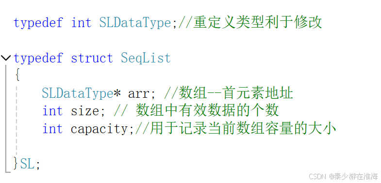 在结构体类型声明中并未直接创建一个数组成员,而是放了一个指向数组空间的指针(可以理解为数组首元素的地址)。因为此处并不知道会用多少空间,需要利用到realloc 进行动态开辟,所以在维护这个顺序表的结构体类型声明中放一个数组首元素地址便可;