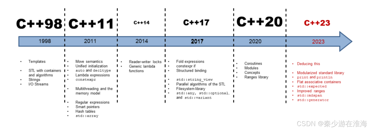 - 也是在1998版本发布之后,C++委员会便制定了一个五年计划:每五年更新一个大版本;