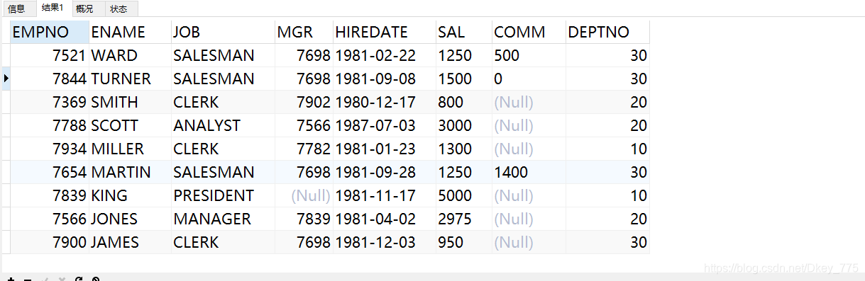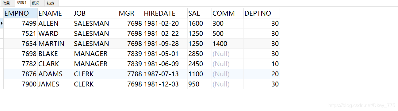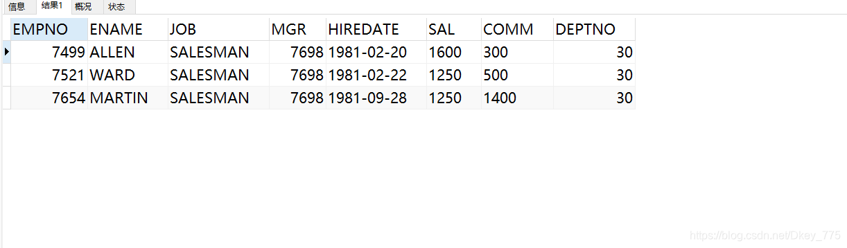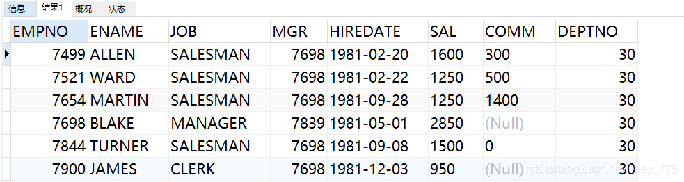 select * from EMP where deptno='30'