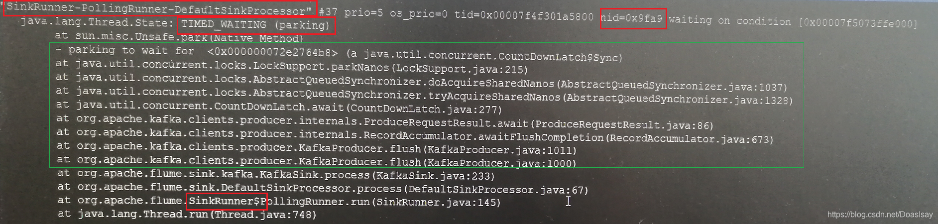 由函数调用栈可知这个线程是kafkaSink线程,由于kafkaSink在写完一批数据到kafka并确认写成功后才会进行事务的commit,所以kafkaSink写数据时是以同步的方式写的,当写完数据后获取kafka ack的同步调用结果时被挂起了
