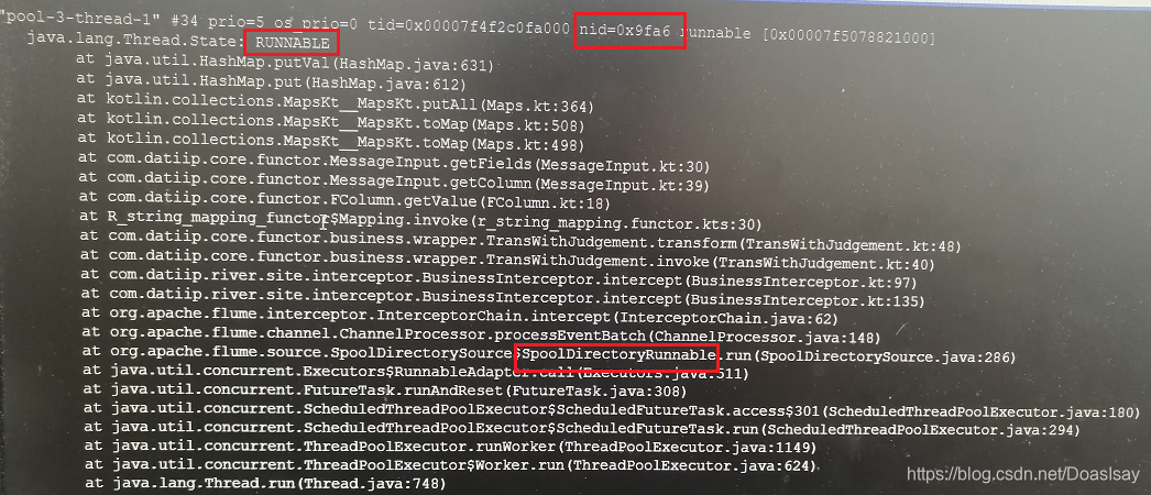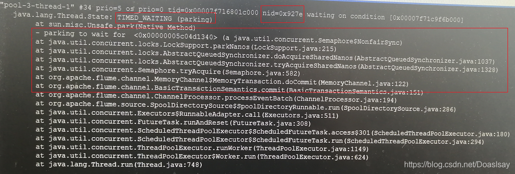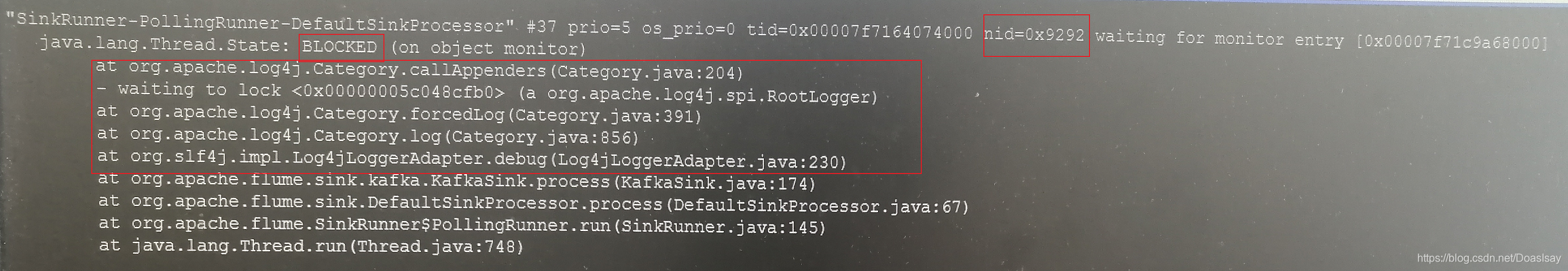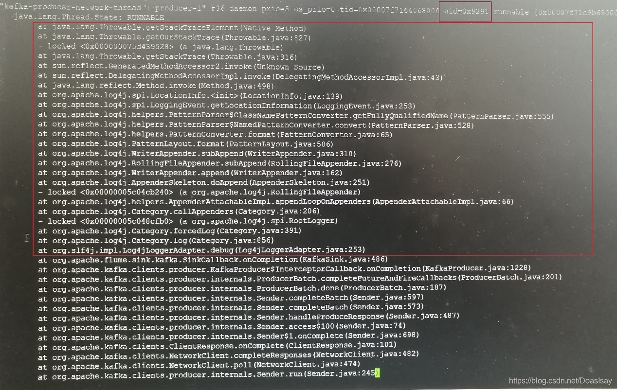 由函数调用栈我们可知此线程是flume的kafkaSink线程,并且此线程在打debug日志做同步时没获取到锁而被挂起了,打个日志竟然被阻塞挂起了,你说你还打不打debug日志