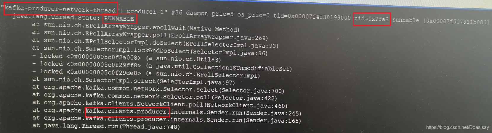 由函数调用栈可知这个线程是kafkaProducer网络IO线程,处于正在运行状态