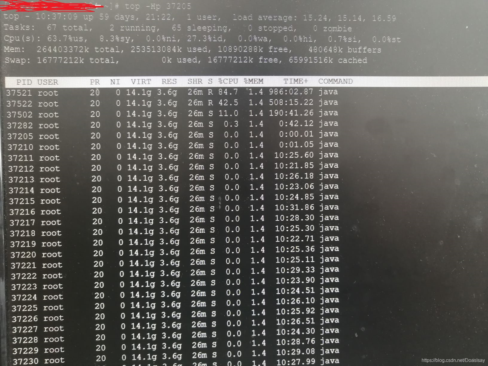 接下来随便挑了一个看着顺眼的pid ,top -Hp 37205看下这个进程中各个线程的情况,如下