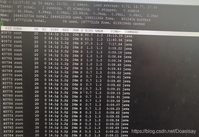 现场同事反应,启动了十几个flume的file2kafka进程去把本地目录下的文件接入到kafka,但是程序处理数据却极慢,一天一个进程才处理20G的文件,一个文件1G左右,排除了小文件会导致文件系统性能下降的可能。在公司大概了解了下现场情况,程序并没有做大量的数据清洗动作,应该是很快的,所以起初怀疑是数据积压太多,数据已经从pagecache落盘,一下启动了太多进程从磁盘读取数据,嗖一下达到了磁盘的性能瓶颈,我设想很多线程处于不可中断的D状态,iowait 88%,负载高达1888,服务器卡死,但到现场top了一下发现不是这么回事,失误,失误