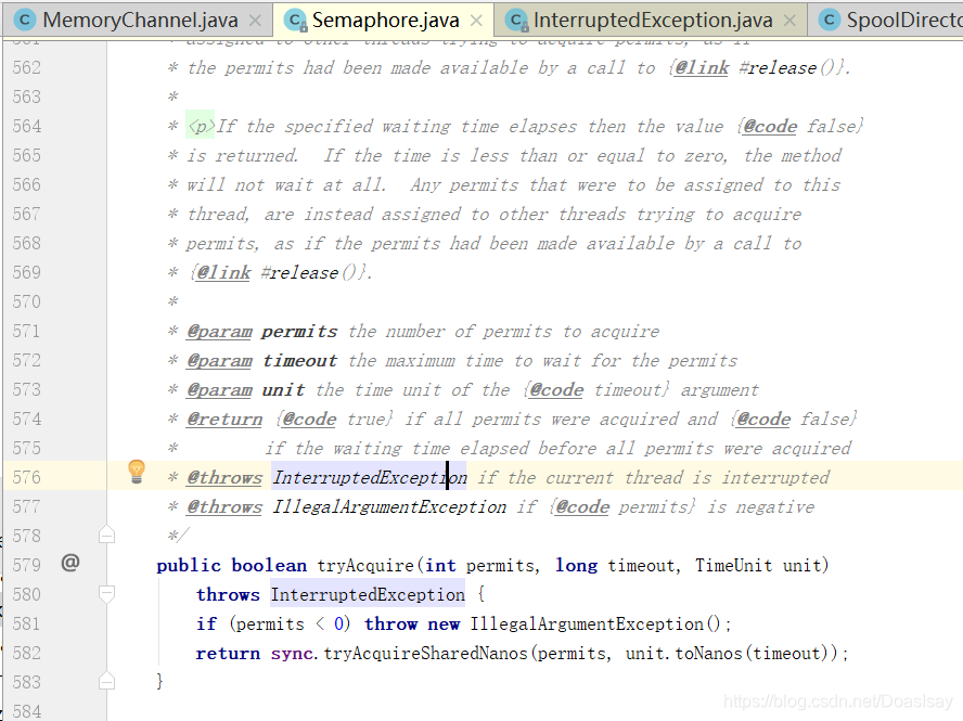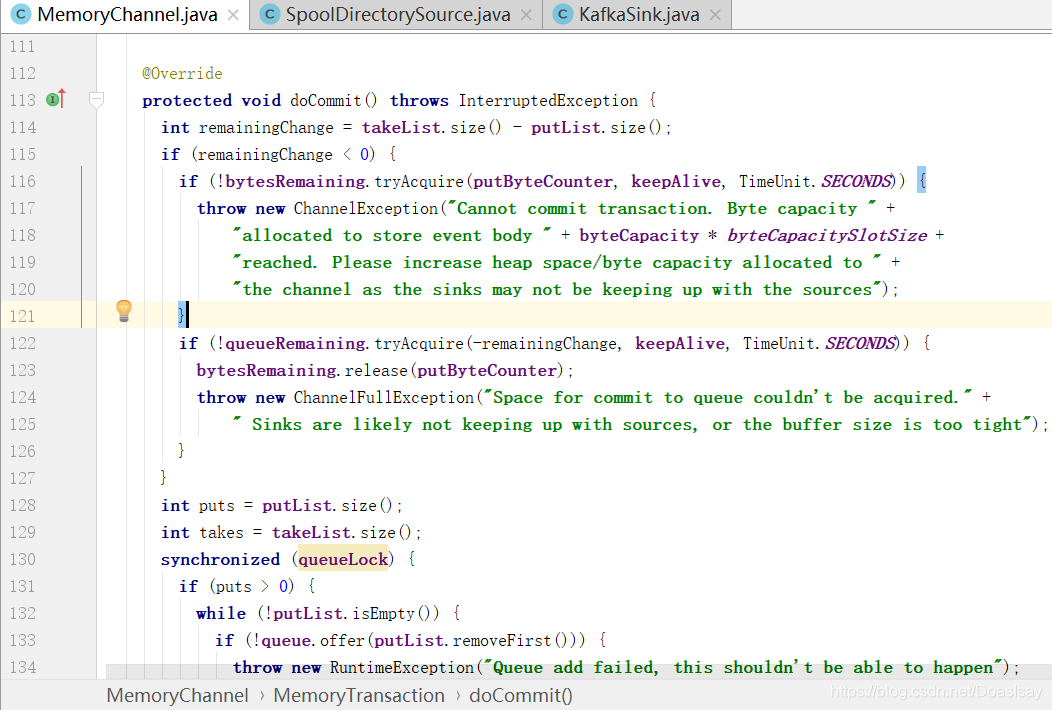 此段代码的大意就是,判断此次事务commit前,sink从channel拿走的数据所占用的空间是否可以容纳此次事务commit source要放入的数据,如果不可以就tryAcquire尝试获取空间(其实就是等待sink取走数据)