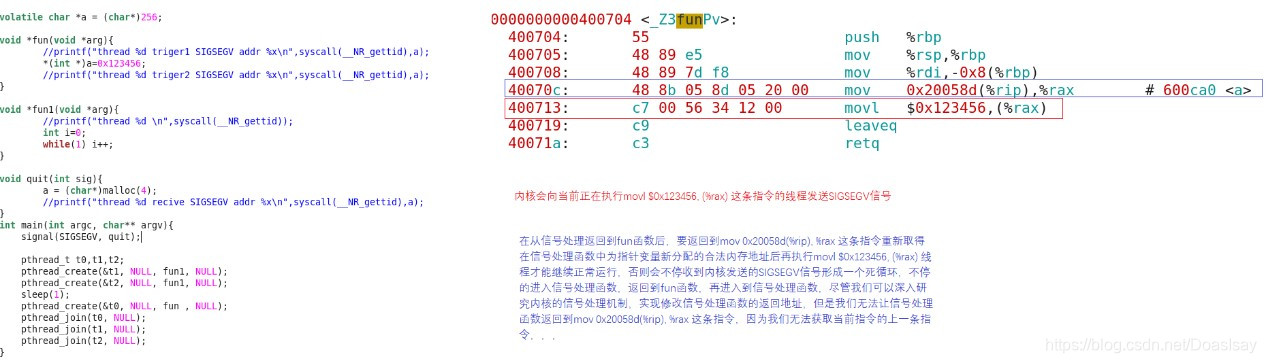经过测试,触发SIGSEGV信号的线程会收到SIGSEGV信号,但是在信号处理函数中无法完成问题2的操作,而且就算问题2可以解决,我们在SIGSEGV的信号处理函数中为协程扩充了栈空间后,此线程也只会被内核不断的发送SIGSEGV信号,因为信号处理函数会返回到触发SIGSEGV信号的那条指令继续执行,而我们无法修改这条指令所使用的地址,也就是在信号处理函数中对a变量的修改无法被fun函数再次获取到