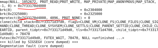由strace 结果可知pthread_create先使用mmap为线程申请了的用户空间stack,然后使用mprotect对stack的栈顶进行保护,即栈顶的4kb无读写权限,一旦被读写就说明产生了栈溢出,操作系统就会向读写此4kb的任务发送SIGSEGV信号,最后才是调用clone创建线程