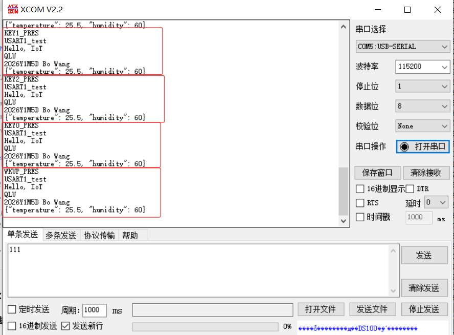 6.编译用下载文件至开发板,接收按键指令后自动发送预存的信息。