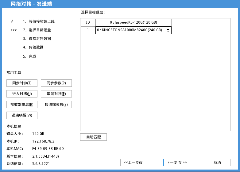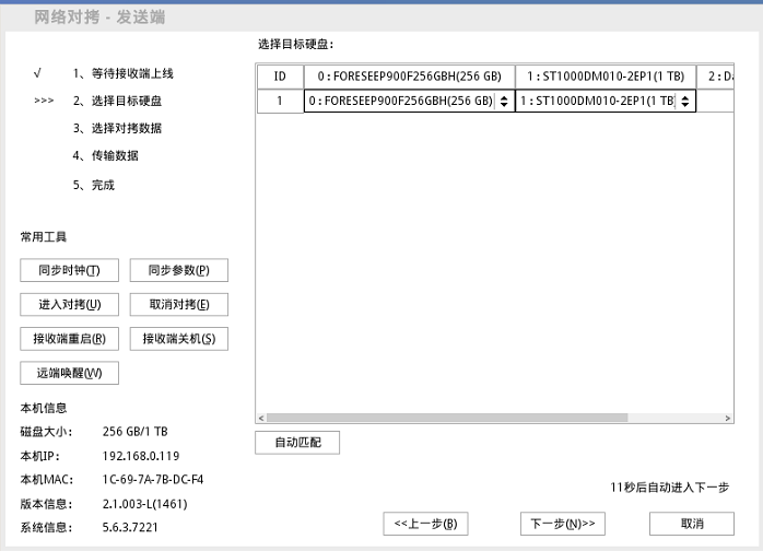 说明:在该界面可以点击自动匹配来选择接收端的硬盘接收哪个发送端的硬盘,也可以点击下拉框选择想拷贝的对应的硬盘。