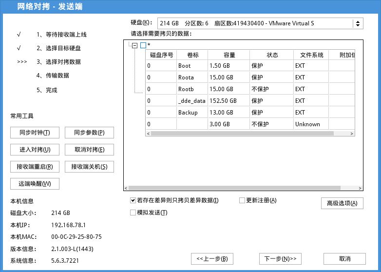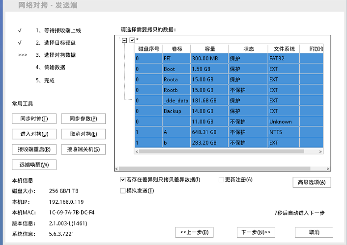 4)勾选好选项后,点击下一步开始执行对拷操作。发送端画面如下图: