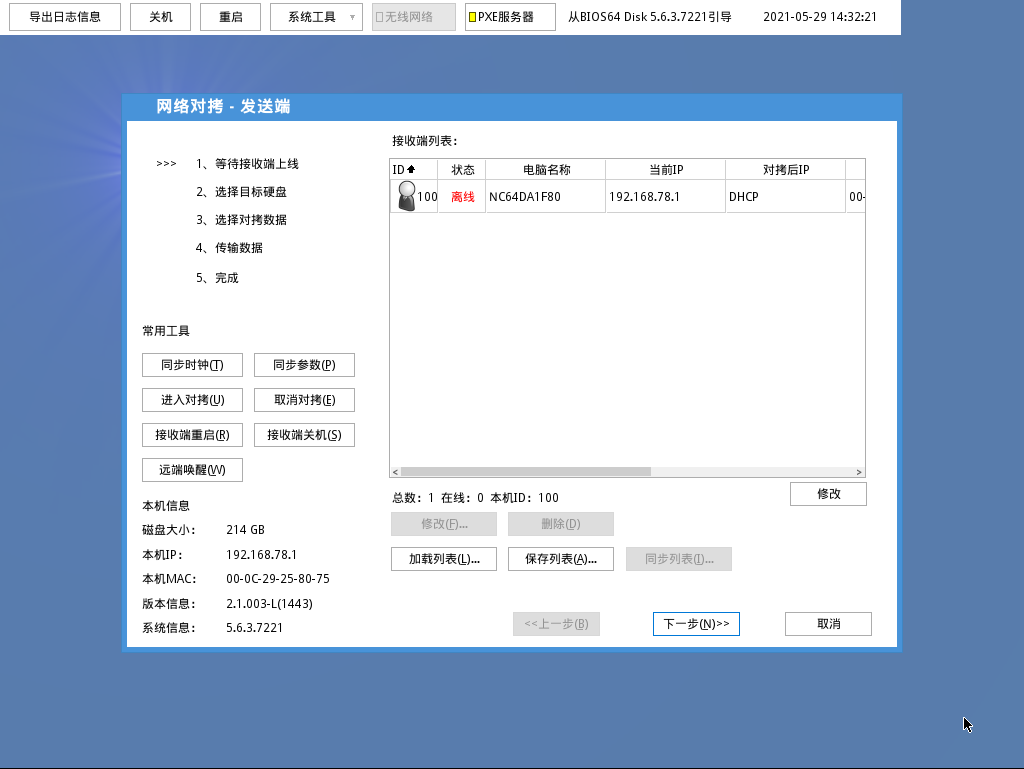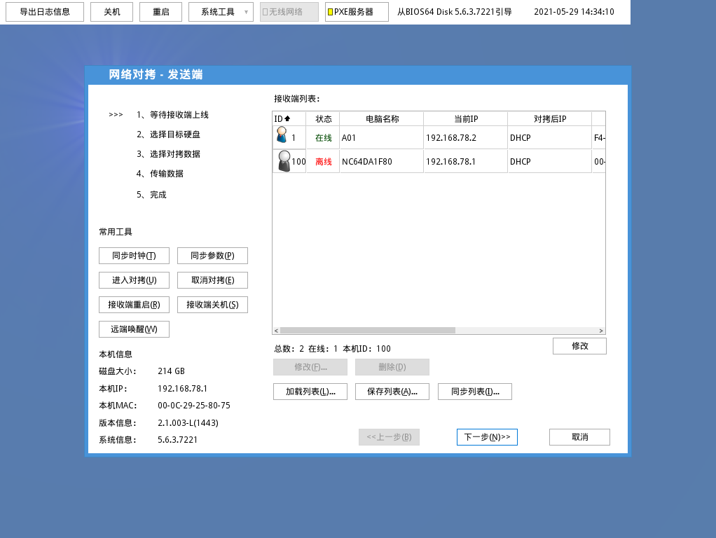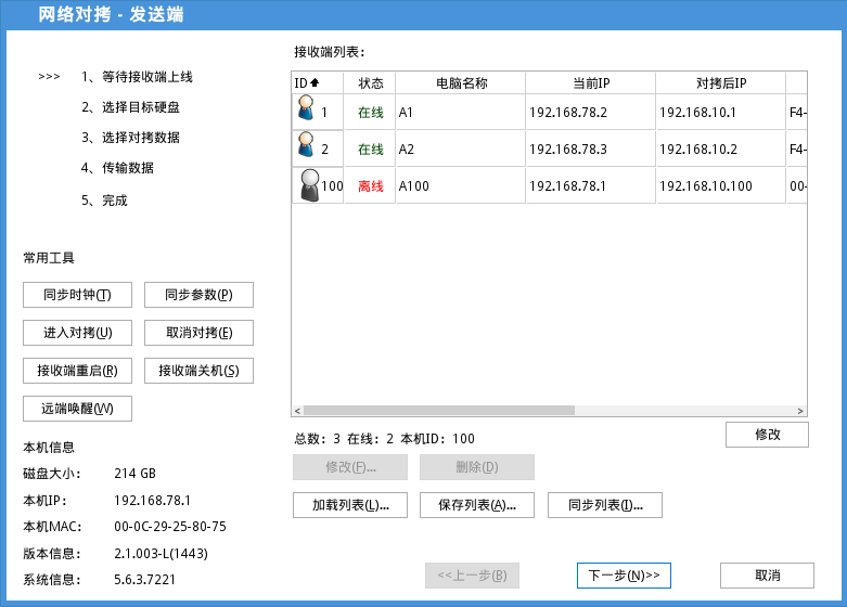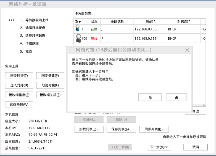 注:请在选择对拷数据前,确认所有接收端均已上线;未上线的接收端在开始进行对拷后将无法再次登录发送端。