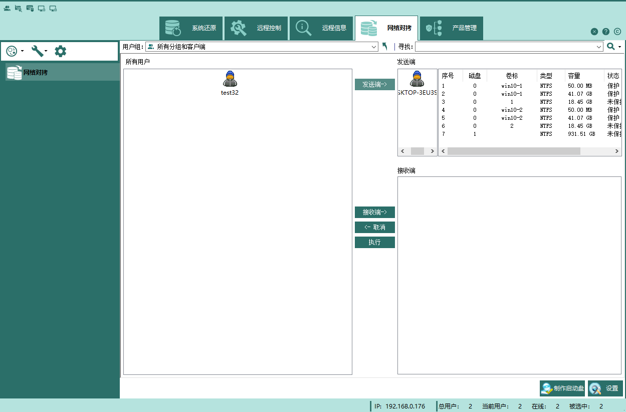 2.选中一个被控端用户作为网络对拷的发送端,点击发送端按钮,将该被控端添加进发送端栏内。此时发送端栏内将显示该被控端的硬盘状态;相同的方法您可以将多个接收端添加进接收端栏内。如下图: