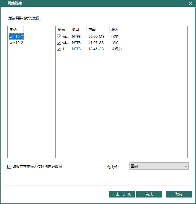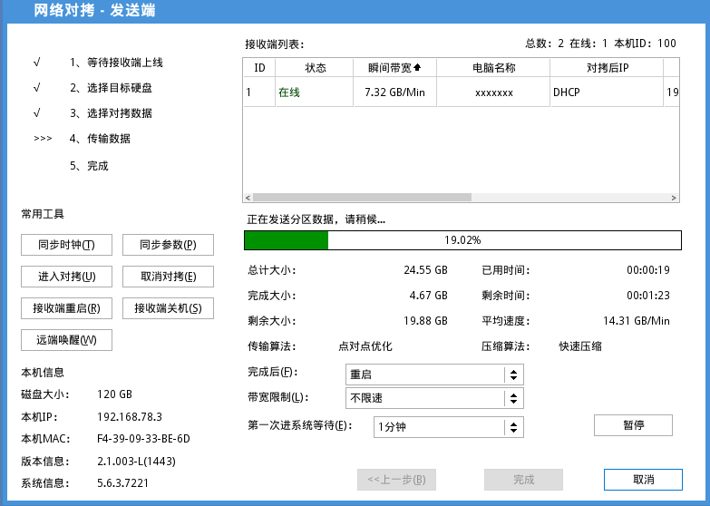 对拷设置完毕后,点击完成。此时被控端电脑开始执行增量对拷的功能;发送端和接收端都会自动重启进入对拷界面进行对拷。