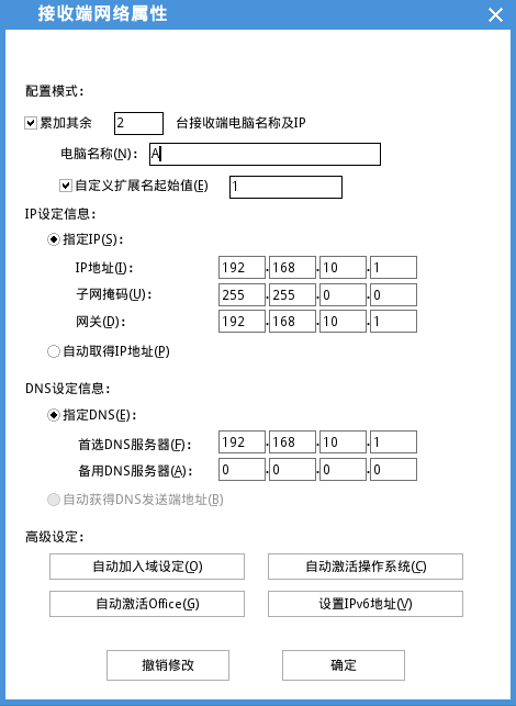1)修改电脑名和IP(修改的是对拷完成进入系统的电脑名和IP),双击ID 为1 的电脑。勾选累加其余,勾选自定义扩展名起始值,设置第一台电脑的IP 和电脑名,然后点击确定: