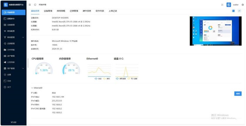 2. 终端管理平台:可远程查看设备硬件信息、监控上网情况,软硬件资产统计,批量修改IP地址、设置U盘/光驱权限,实现精细化资产管理。