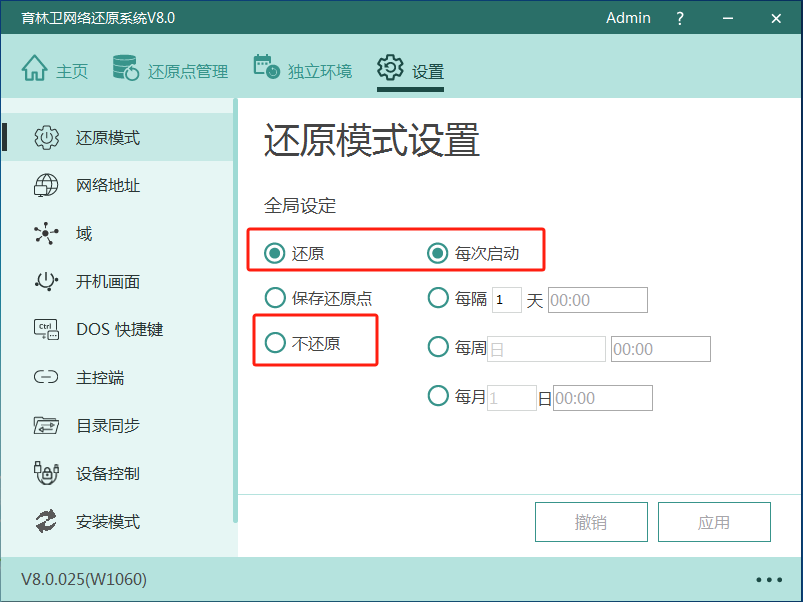 打开还原被控端,选择设置——还原模式,将还原模式从自动还原改成不还原: