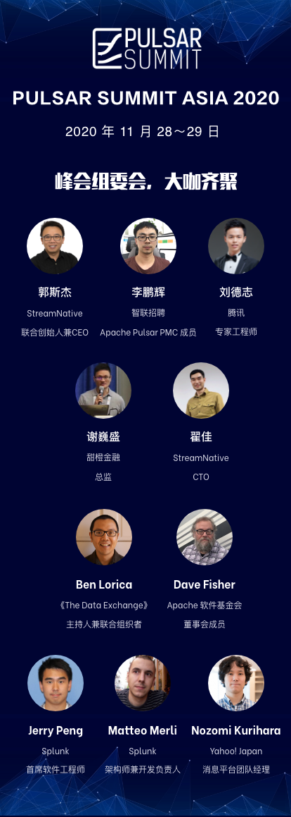StreamNative 是本次 Pulsar Summit Asia 2020 的组织方,也是 Apache Pulsar 背后的商业支持公司。StreamNative 由 Apache 顶级项目 Apache Pulsar 、Apache BookKeeper 原生核心开发者组建而成,围绕 Apache Pulsar 及 Apache BookKeeper 打造下一代流数据平台。StreamNative 专注于开源生态和社区构建,致力于前沿技术领域的创新,创始团队成员曾就职于 Yahoo、Twitter、EMC 等知名大公司。