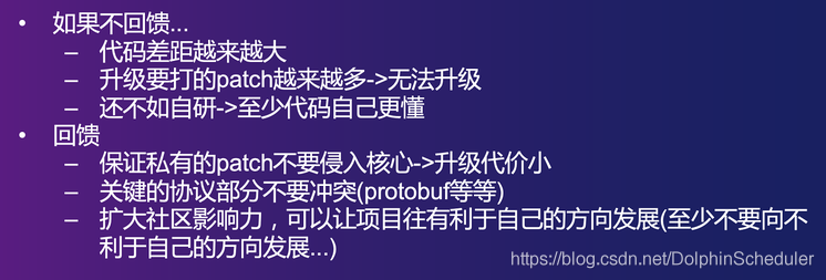 引用HBase社区张铎老师的 PPT,参与开源,将内部的 feature 回馈给社区,参与社区开发,可以保证自研代码和社区代码的步调一致,享受到社区最新的功能