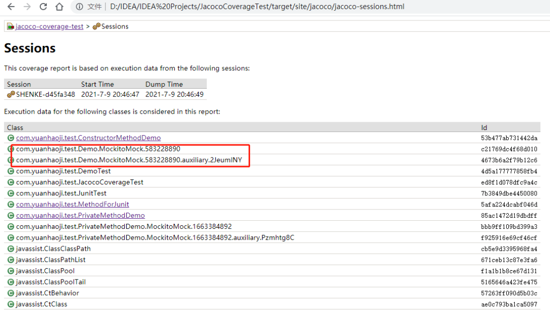 如下图所示,Demo 类后面还跟有 MockitoMock 的字样,说明这是一个由 PowerMock 模拟的对象,而 JaCoCo 却错把它以为是最开始时所加载的 Demo 类。