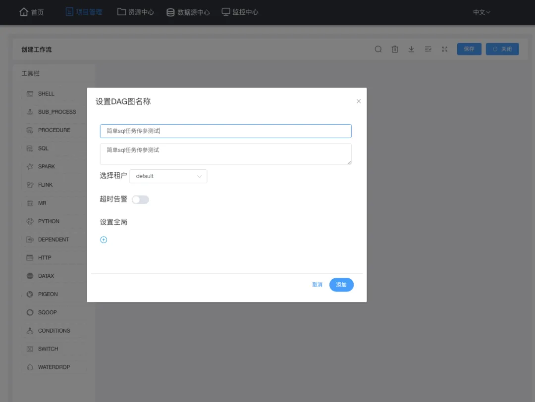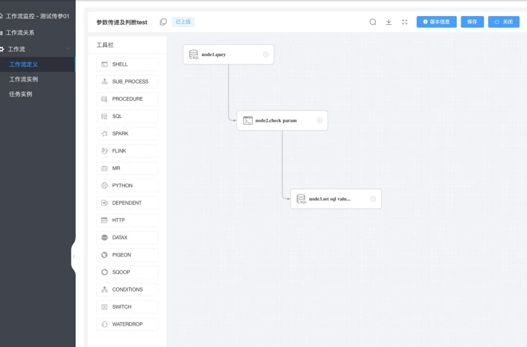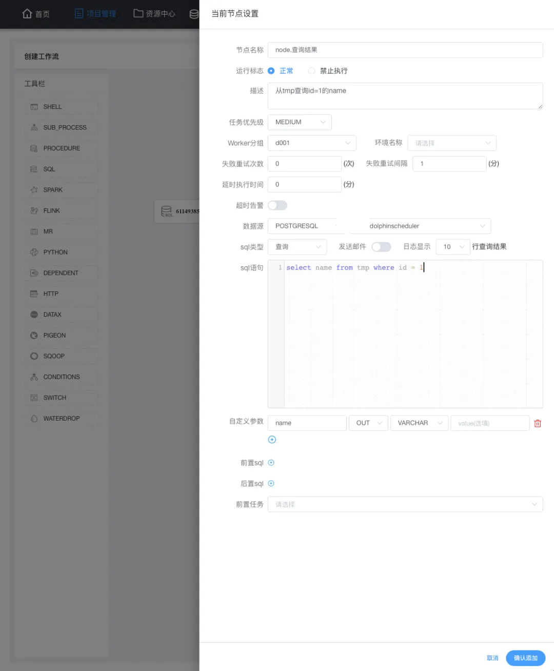 拖动 sql任务 到画布会自动弹出节点定义,上图为当前节点的一个定义,重点是:数据源、sql类型、sql语句,如官方所说,如果将 name 传递到下游,则需要在自定义参数重定义这个 name 为 out方向 类型为varchar。