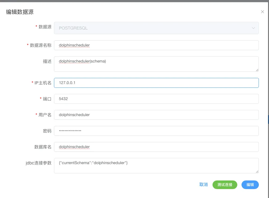 表及数据入库,请将tmp所属的库配置到 DS后台->数据源中心->创建数据源 ,以下是我的配置,记住,这里面的所有数据库配置均遵守所属数据库类型的jdbc 的 driver 的配置参数,配置完成也会在DS的数据库生成一条 jdbc 的连接地址,这点要明白~