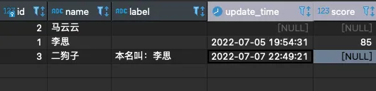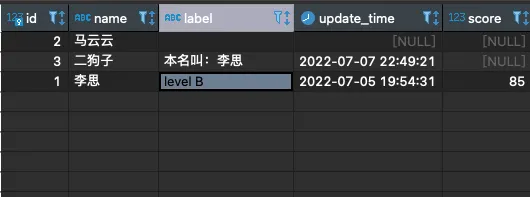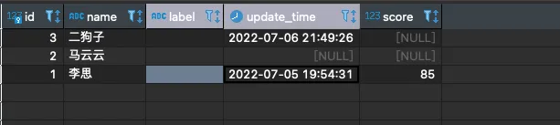 思考一个问题:可以看到李思的score是85,根据score应该被评为 B(>=90的为A)并写入到 label字段,该怎么办呢?如果这个分数是90分又该怎么办呢?如果根本没有score(分值) 这个任务是不是就不需要更新李思的label(评分)呢?