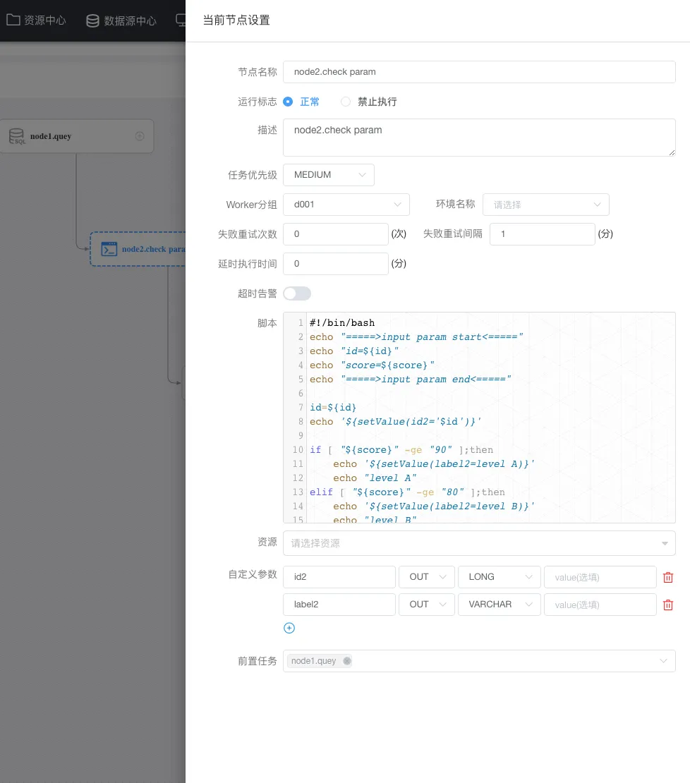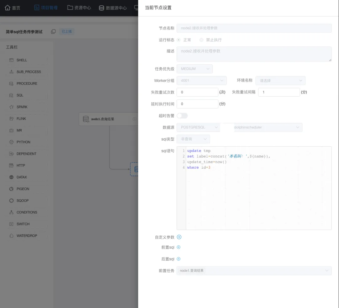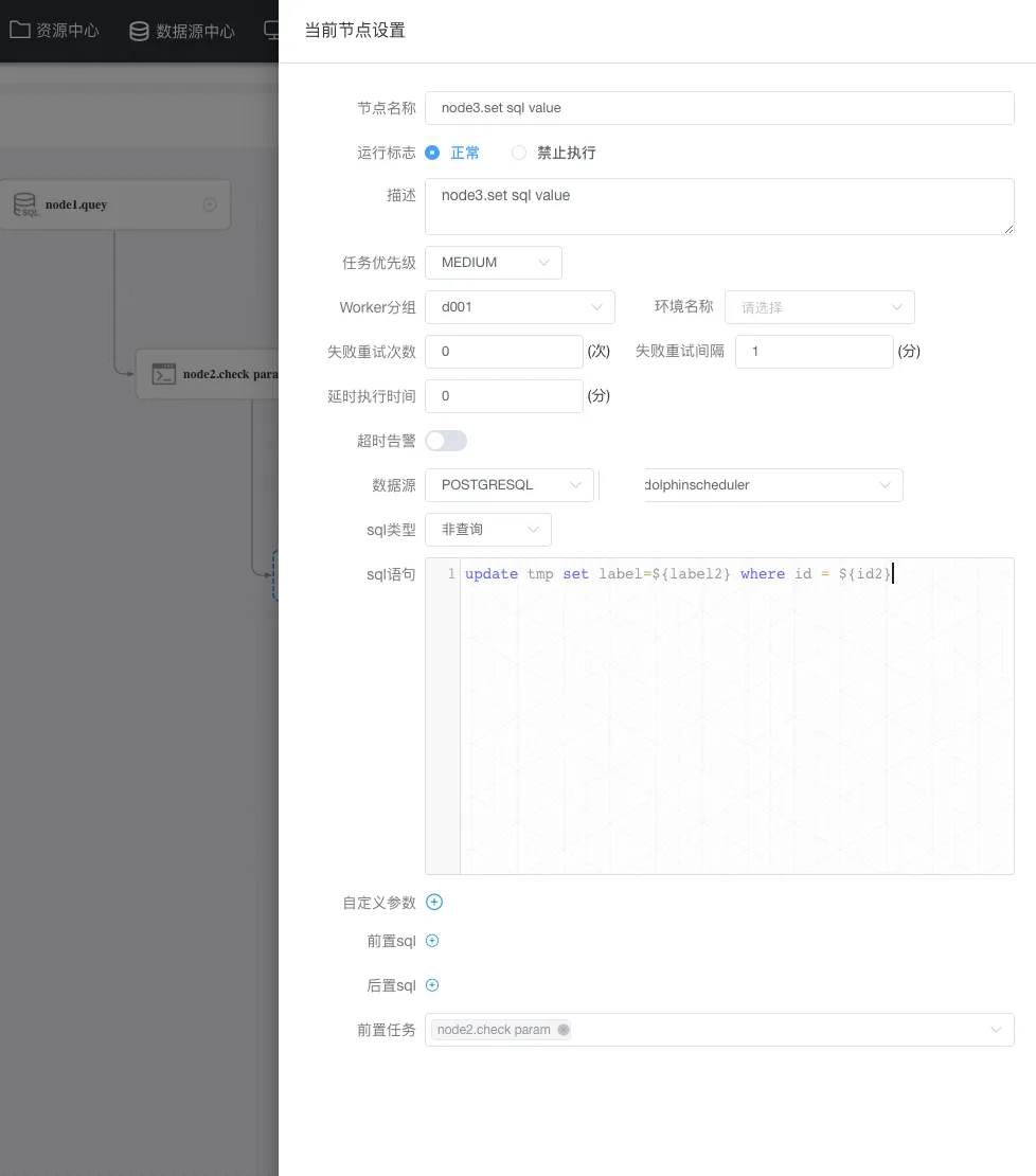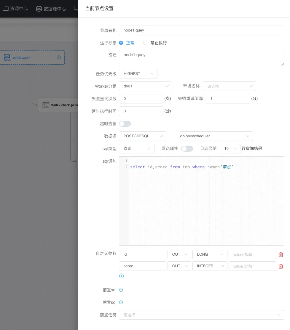 这里不仅仅要注意 sql类型 (sql类型与sql语句是一一对应的,类型不能错) ,还有就是前置任务一定要选中(上面定义的) node1节点。另外,需要注意的是当前任务是上下游传参,所以在node2 中是直接使用 node1中定义的 name 这个参数。