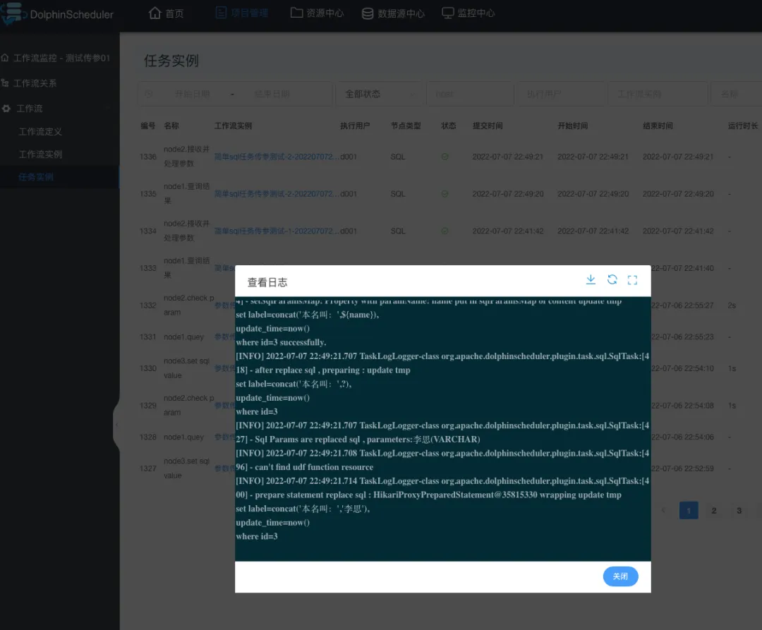 定义的任务需要上线了才可执行,所以在工作流定义列表先点该任务的黄色按钮(任务上线),然后才是点绿色按钮(执行任务):