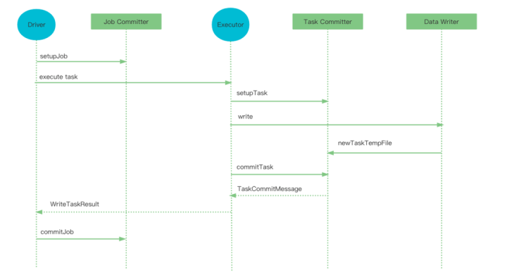 最后 driver 端执行 commitJob 方法,将各个 task 任务提交的数据文件,从 Job 临时目录转移到 Job 的最终目标目录。