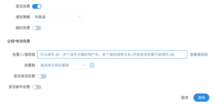 **告警管理,**我们把超时告警和失败告警整合到了定时调度配置页面来一起设置,并支持告警到值班组。因为我们实际需求是只需要对定时调度的实例去告警,其他手动运行或是补数的实例不需要告警,因此这两个超时和失败告警整合到定时调度配置页面,在配置调度的时候去配置告警。