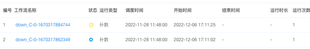 那这种情况下补数去触发下游,其实也是一个工作流实例的 DAG 了,因此我们不仅支持查看补数的进度,还可以知道当前补数是补到哪个工作流的哪个调度时间。