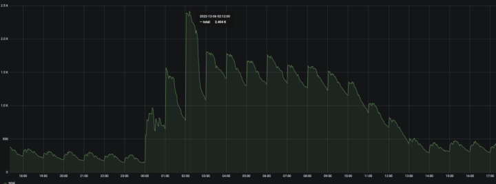 在夜里高峰时段同时有 2400 多个工作流实例运行,这些实例主要以 Spark、Sparksql、Shell、Python、Sqoop 节点为主。