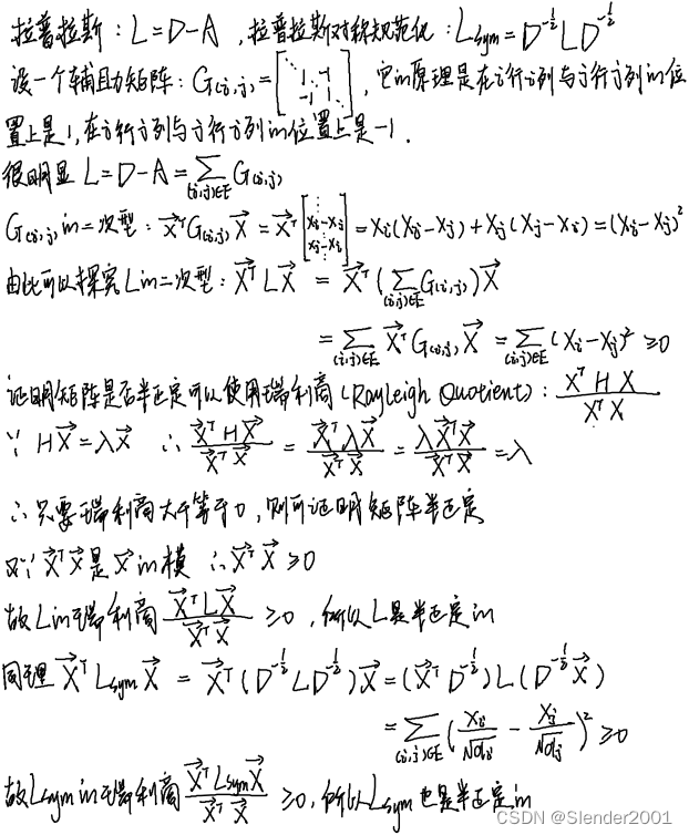 研究GCN免不了涉及到谱图理论,首先需要先了解两个与邻接矩阵相关的矩阵的特性。这两个矩阵,一个是拉普拉斯矩阵,另一个是拉普拉斯矩阵对应的对称规范化矩阵。之所以要研究这两个矩阵,是因为这两个矩阵都是实对称阵,都具有n个特征值和n个正交的特征向量,同时这两个矩阵都是半正定的,即它们的特征值都大于等于0。下图解释了为什么这两个矩阵是半正定的。