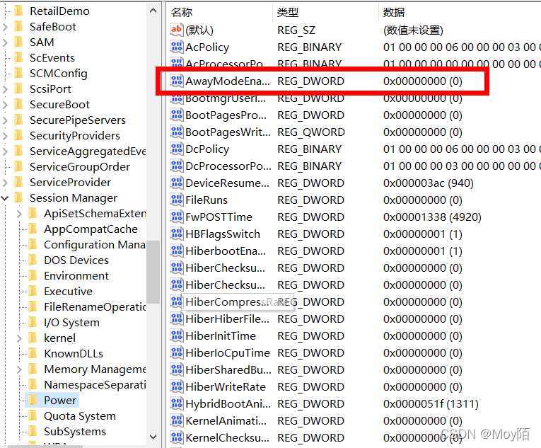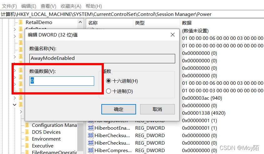 点击Power 后,在右侧双击打开“AwayModeEnabled”值,然后将其数值数据修改为0点击确定保存