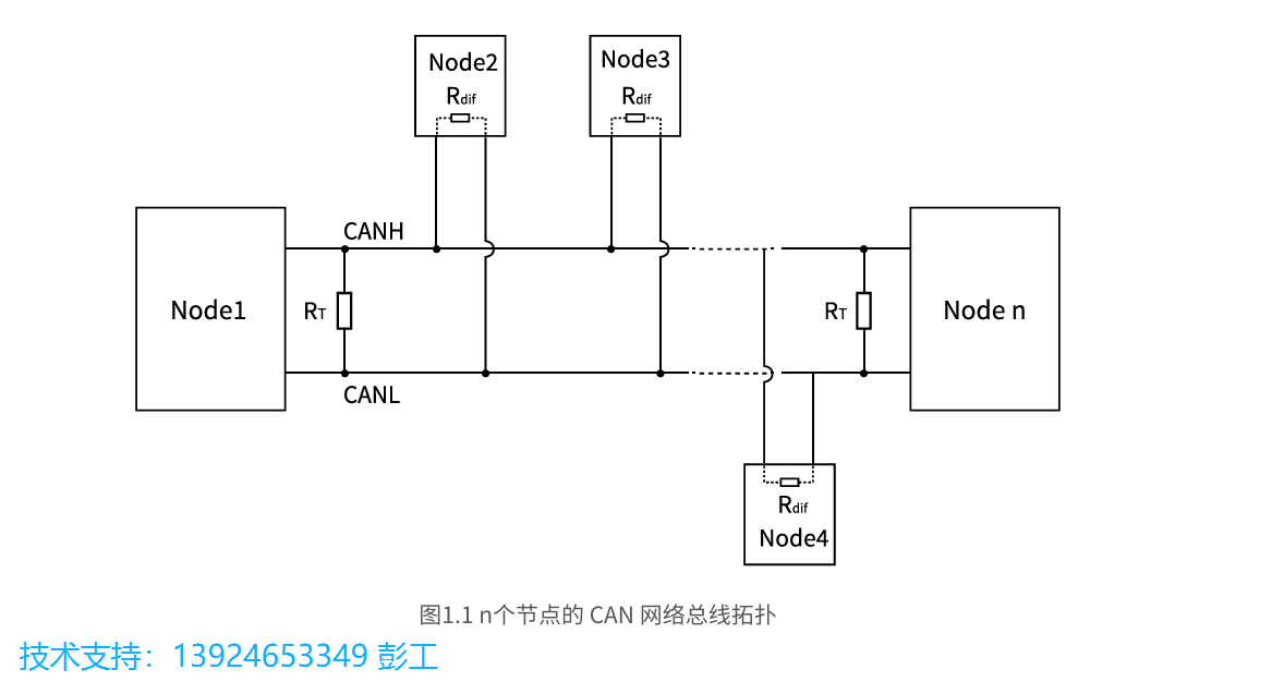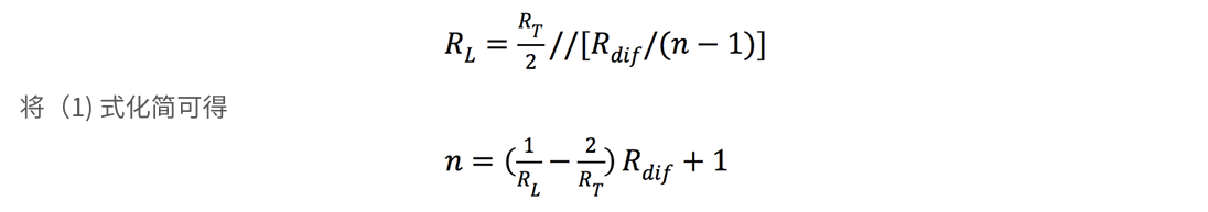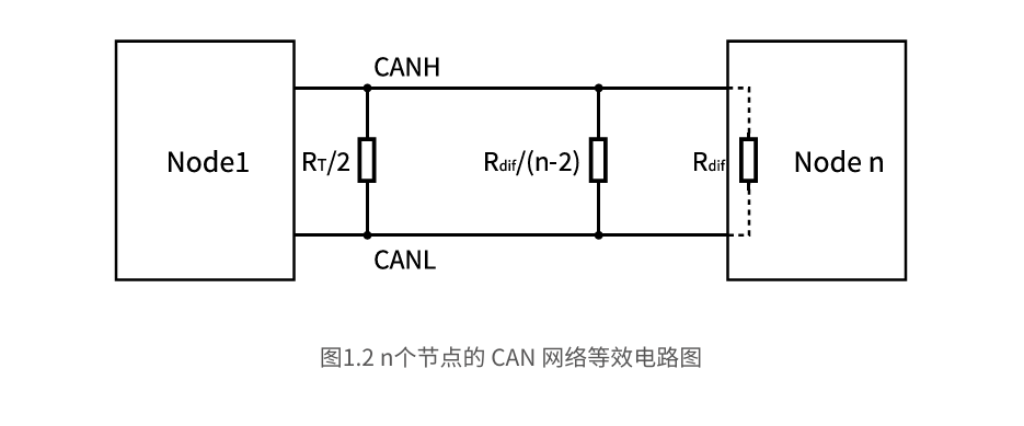 上图为挂载n个 CAN 节点的总线网络拓扑示意图,其中 RT为终端匹配电阻,Rdif 为 CAN 收发器的总线差分输入电阻。 可以通过电路等效的方法得到如下所示简易拓扑图: