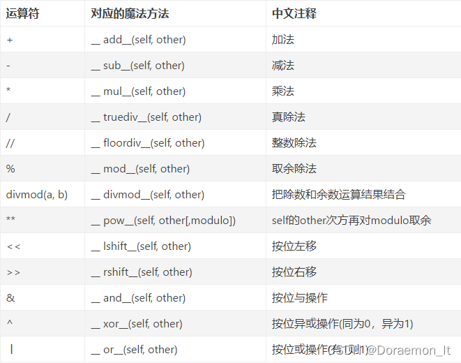 | __ rmul__(self, other) | 定义乘法的行为:*(当左操作数不支持相应的操作时被调用) |